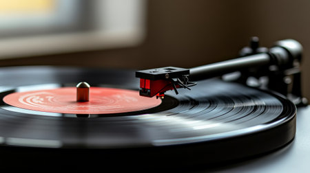 Close up of a turntable playing a vinyl record with a red label, the warm light creating a nostalgic atmosphere as the needle reads the grooves of the spinning disc
