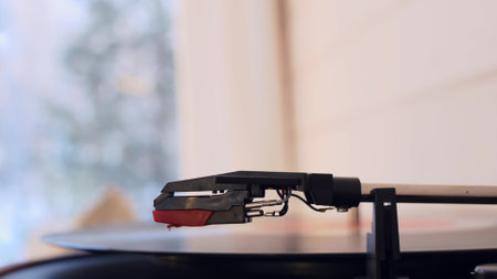 Stylus needle playing vinyl record on turntable close up. Retro analog music equipment with soft ambient lighting. Nostalgia, vintage audio, and timeless sound experience concept.