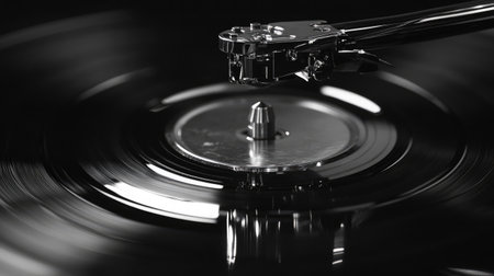 Experience the charm of a vintage turntable as it plays a vinyl record, showcasing the intricate needle and textured grooves in a timeless monochrome setting.