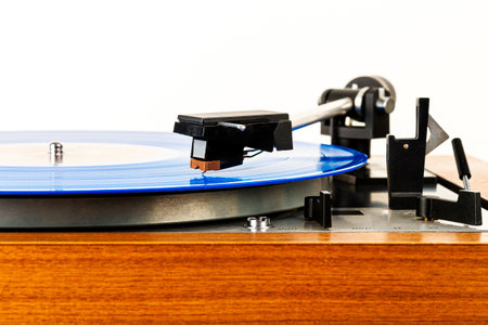 Close-up of modern turntable vinyl record player with music plate. Needle on a vinyl record. Concept of sound technology audio equipment