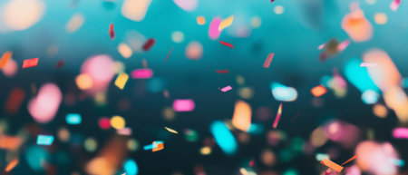 A vibrant shower of confetti cascades across a blurred turquoise backdrop, embodying a festive and joyful atmosphere ideal for celebratory themes.
