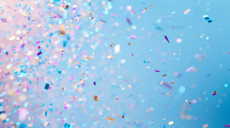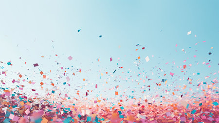 Colorful confetti falling against a light blue background, creating a festive and celebratory atmosphere