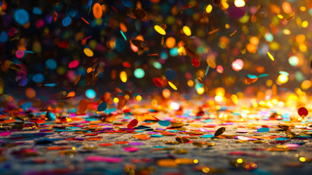 A vibrant collection of colorful confetti is scattered across a blurred ground, creating a festive and celebratory atmosphere. The image symbolizes joy and celebration.