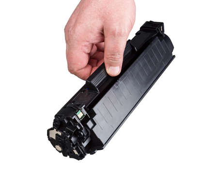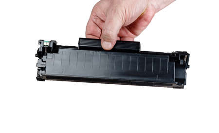 Cartridge for printer in hand, isolated on white background