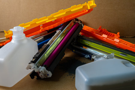 Colorful printer cartridges and wasted toner bottles scattered on a cardboard surface with spilled black powder.