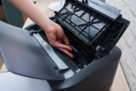 Man is replacing black cartridge in a laser printer