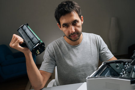 Close-up portrait of bearded repairman smiling performing printer maintenance, replacing empty toner cartridge with new one on desk, ensuring smooth office operations and diy repair.