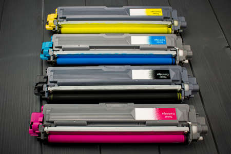 New toner cartridges for laser printer in magenta, black, yellow and cyan colors, close-up, on gray wooden background