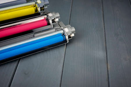 Three used toner cartridges in a color laser printer on gray wooden background for recycling