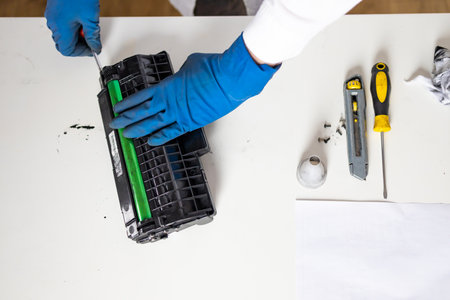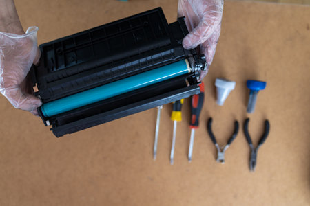 hands repairing laser toner cartridge. Refilling toner in a laser printer cartridge, office equipment maintenance concept.