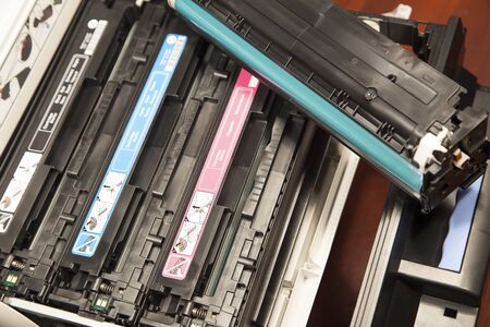 Close-up of the four replacement cartridges for the toner of a color laser printer