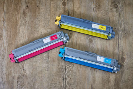 Magenta, yellow and cyan color laser printer cartridges over wooden table
