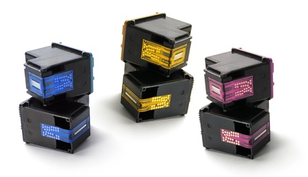 Four color printer cartridges arranged in a row on a beige background represent printing supplies, maintenance, and office service