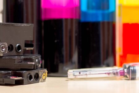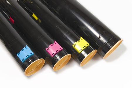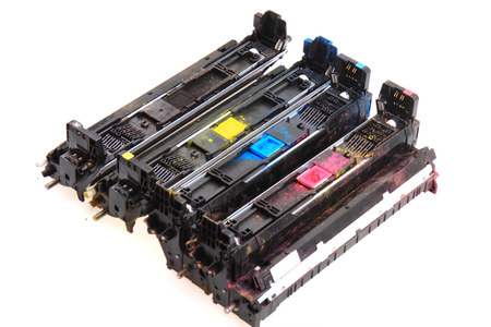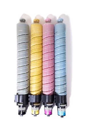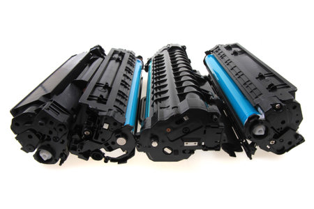 Toner cartridge set for color laser printer. Microcircuits. Equipment for printingon white background.