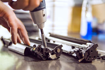 Service center and workshop concept. Man refilling cartridge toner for printer. Ink bottle on white table. Repairman fixing in gloves.