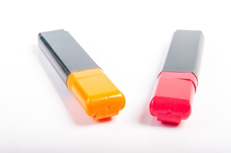 Multi colors highlighter pen line up in slots. A large number of multi-colored markers.
