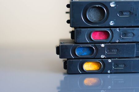 Side view of magenta, cyan and yellow toner for color laser printers stacked on gray wooden background