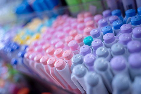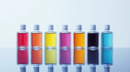 A stunning arrangement of colorful liquid-filled bottles reflecting on a smooth surface. Perfect for themes of wellness, design, and modern art.