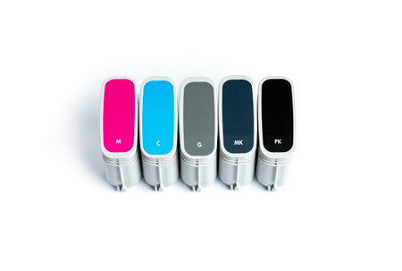 Cartridges for wide format plotter on the background of SMYK. Bright creative concept minimal