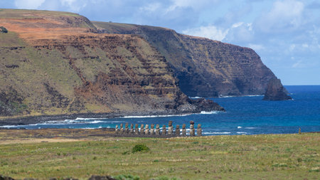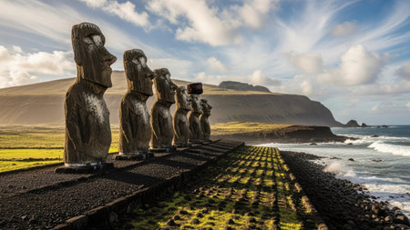 A line of towering ancient Moai statues stands on a stone platform, overlooking the ocean under a cloudy sky. The sculptures showcase weathered textures and are illuminated by sunlight. This scene suggests a historical context with potential uses for travel, cultural heritage, and educational purposes.