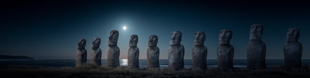 Ancient Moai statues standing by the ocean under a night sky with bright moonlight. Moai statues on Easter Island watching rising moonlight