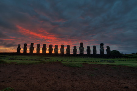 Dramatic colorful sunrise over Moai stone sculptures at Ahu Tongariki, Easter island, Chile.