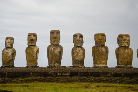 Moai statues in a row under cloudy sky, Easter Island, Chile