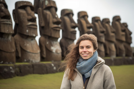 Portrait of a young woman standing in front of stone statues at Easter Island