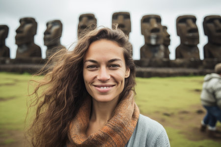 Portrait of a young woman in front of the statues of Easter Island