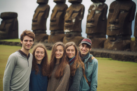 Group of friends posing at Easter Island, Chile. They are smiling and looking at camera.