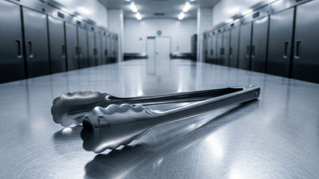 A panoramic, wide-environment shot of massive, professional metal serving tongs resting on a cold, s