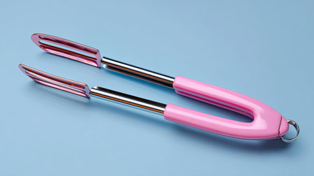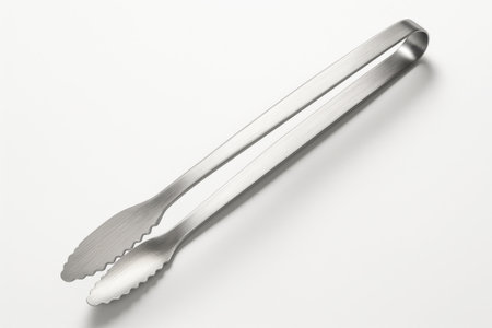A sleek, shiny metal tongs resting on a minimalist background, showcasing modern kitchen design and functionality. Ideal for cooking and serving.