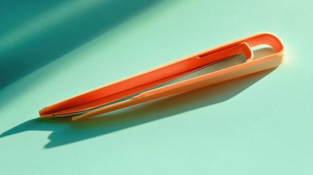A bright orange hair straightener rests on a soft aqua background, creating dynamic shadows. This stylish and modern hair tool appeals to beauty enthusiasts and professionals alike.