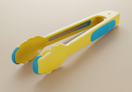 A pair of yellow and blue plastic kitchen tongs are displayed on a beige surface. The tongs are open, showcasing their gripping ends and handle design, perfect for serving or cooking food.
