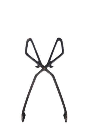 A pair of vintage metal fire tongs, used in open fires or combustion heaters
