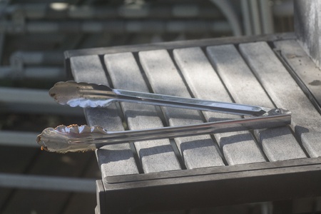 Grilling tongs isolated. BBQ metal equipment, steel barbecue tong on white background