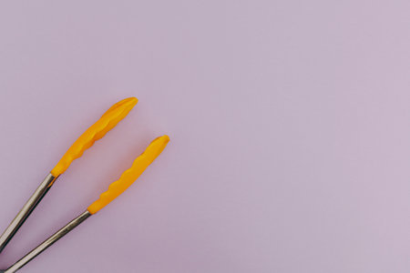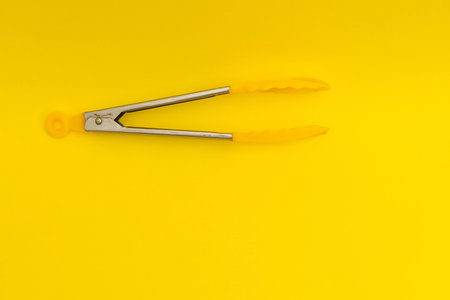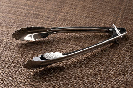 Metallic kitchen tong top down flat lay with the tool closed and placed diagonally under even overhead lighting