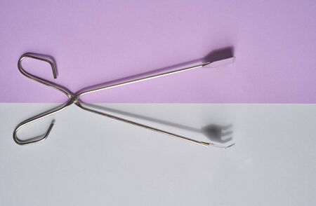 meat tongs, metal, open on gray and pink duotone bottom, top view