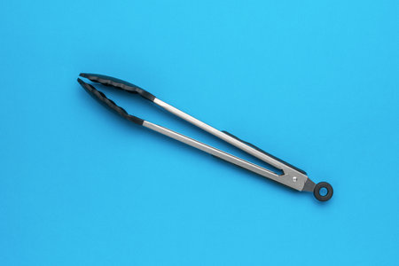 Stainless Steel Kitchen Tongs on Blue Background - Modern Cooking Utensil Stock Photo