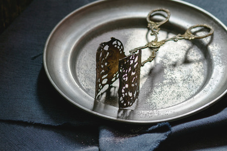 Empty vintage metal plate with sugar powder and cake tongs over blue textile. Dark rustic style. Day light. Outside view