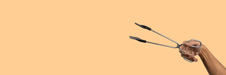 Male hand holding a metal and plastic kitchen tong on peach background banner