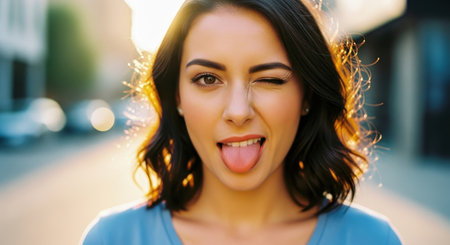 Playful young woman winking and sticking out her tongue, looking directly at the camera with a cheeky expression. captures fun, humor, and joy in warm golden hour light outdoors.