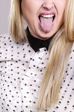 Blonde unrecognizable woman sticking tongue out having fun wearing black and white dotted elegant shirt.