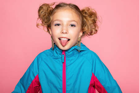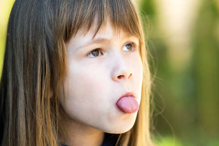 Close up portrait of cute girl showing tongue.