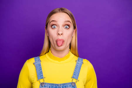 Close up photo of lovely cute person showing her tongue wearing yellow turtleneck denim jeans overalls isolated over purple violet background