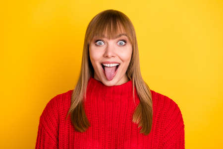 Photo of blond nice optimistic lady tongue out wear red sweater isolated on bright yellow color background