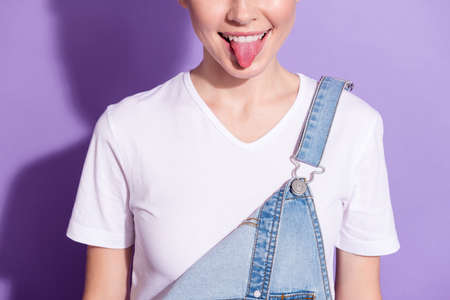 Cropped photo of childish funny young lady neck wear jeans overall showing tongue isolated violet color background