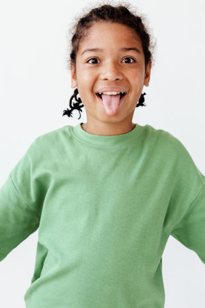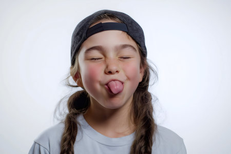 Playful young person sticking tongue out in front of clean white background, showing carefree and cheeky attitude
