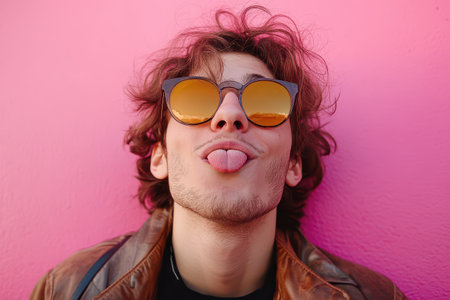 A young man with sunglasses sticks out his tongue while posing in front of a bright pink wall. His playful expression adds energy to the setting.