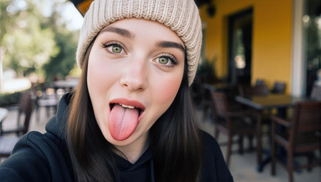Playful young woman in beanie playfully sticking out her tongue outdoors